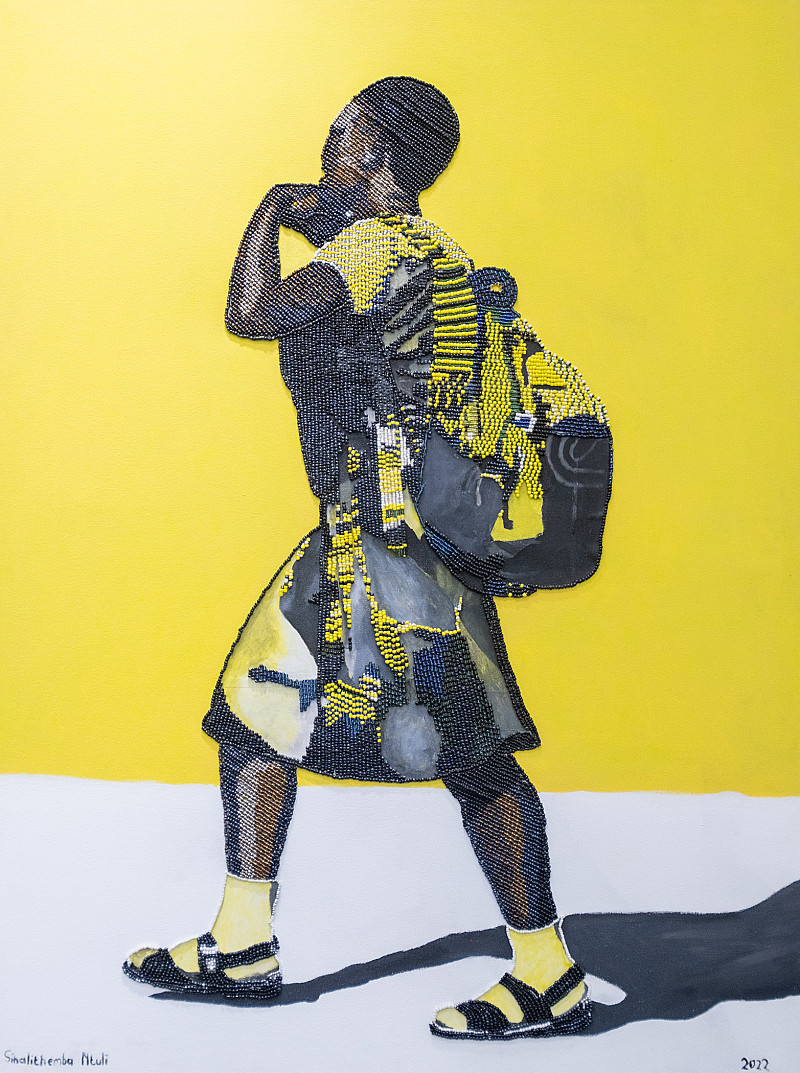 , SINALO NTULI , Beads, acrylic & collage on canvas