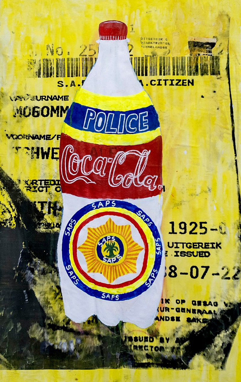 , RAMOTOANA MOKGOMME , Collage & Acrylic on brown paper